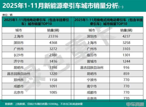 纯电动(不含换电)牵引车主要销售城市为上海市(23316辆)、深圳市(4368辆)、广州市(3272辆)等,换电牵引车主要销售城市为深圳市(4237辆)、上海市(3258辆)、广州市(3103辆)等。