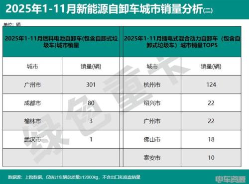 燃料电池自卸车在广州市销售301辆,成都市销售80辆,在榆林市销售3辆,武汉市销售1辆。插电式混动自卸车在杭州市(124辆)、广州市(22辆)、绍兴市(22辆)、佛山市(18辆)、泰安市(10辆)等城市有销售。