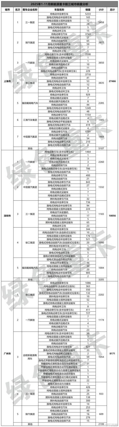 在牵引车领域,上海市、深圳市、广州市断层领先其他城市。