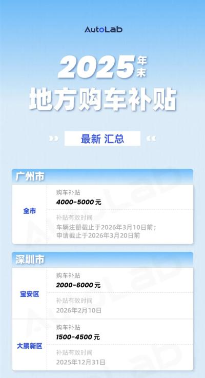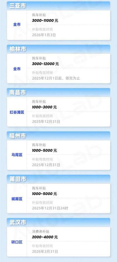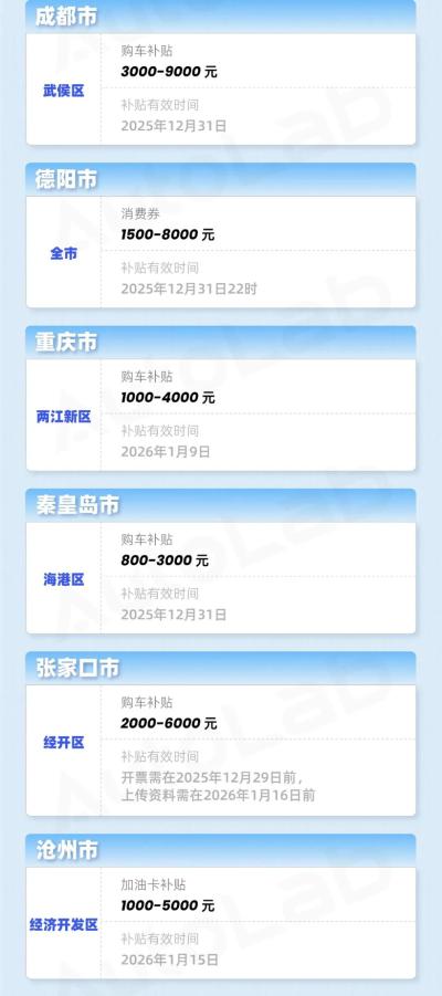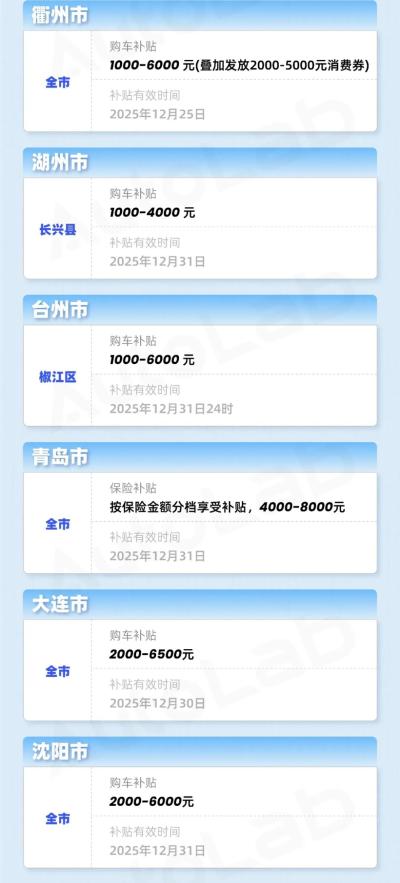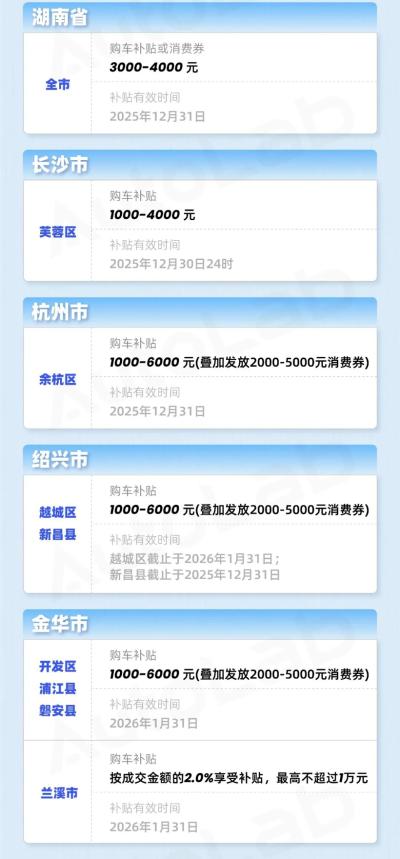 根据各地的官方文件,我们为大家归纳了一份《2025年末最新地方购车补贴汇总》。