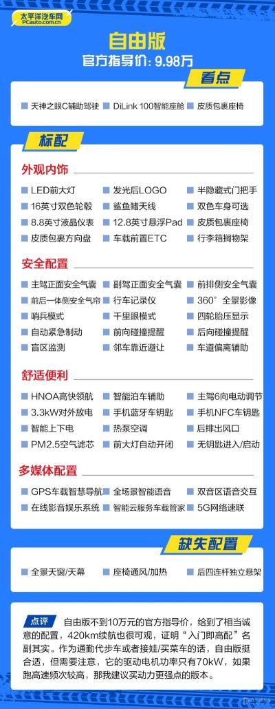 海豚智驾版通过平台架构赋能和智能化升级,让一台A0级纯电车告别“通勤够用”,走向“精品享受”。入门的自由版产品力就已经比肩一些同级别的高配车型,作为城市通勤车或者接娃送娃车,算得上高规格体验;而如果从性价比的角度出发的话,那么中配的时尚版是最均衡且最值得推荐的,是大部分消费者的理性选择;高配的骑士版则是面向对长续航、车载冰箱有需求的用户。