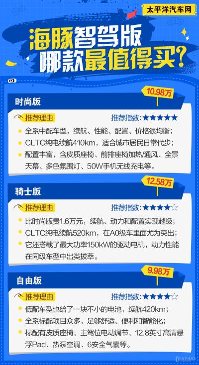 目前海豚系列主打的是新款的智驾版,共有三款配置,全系标配天神之眼C-辅助驾驶三目版(DiPilot 100)和智能座舱高阶版-DiLink 100。如果你正在打算购买海豚智驾版,也许纠结选哪款合适,接下来,编辑会对各个车型展开详细分析,帮助你挑选最具性价比或者最适合你的那款。