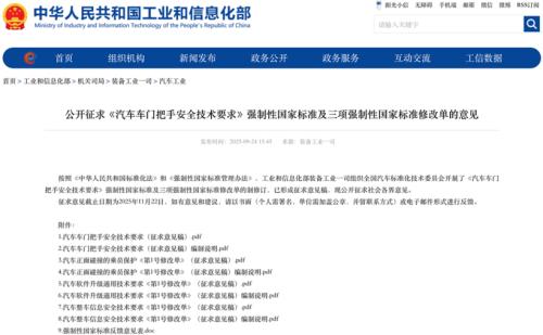 9月24日,《汽车车门把手安全技术要求》征求意见稿正式完成,其中提出多项技术细节,如所有车门(不含尾门)必须同时配备具备机械释放功能的内、外门把手,令车辆即使在电子系统完全瘫痪时,车门仍可通过机械方式开启;车门外把手在任何状态下必须预留手部操作空间,确保紧急情况可操作。