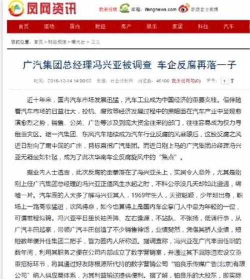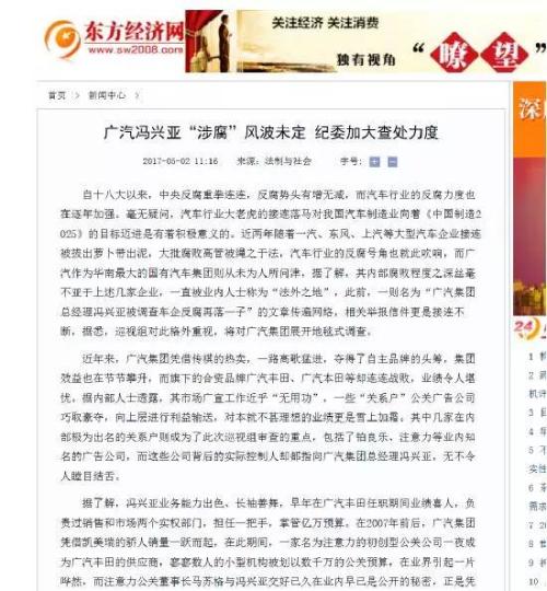 近日,关于广汽丰田冯兴亚营销腐败的新闻屡见报端,继一汽、东风、上汽后,广汽集团是否会成为汽车腐败新的“被关注对象”?