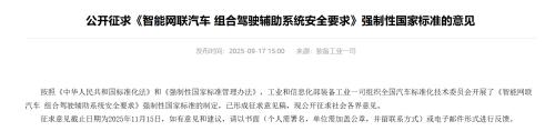 2025年9月,工业和信息化部公开对《智能网联汽车组合驾驶辅助系统安全要求》强制性国家标准,向社会征求意见。这是针对L2级辅助驾驶的首份强制性安全国标,该标准填补了我国组合驾驶辅助系统产品安全基线空白,旨在治理夸大宣传、规范功能安全,要求明确系统边界和驾驶员监测。有行业专家称计划将于2026年正式发布。