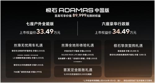 12月28日,极石汽车品牌战略及新车上市发布会在北京举行。“全地形豪华SUV”极石ADAMAS中国版正式上市,官方指导价34.99万-35.99万元,上市权益价33.49万-34.49万元。