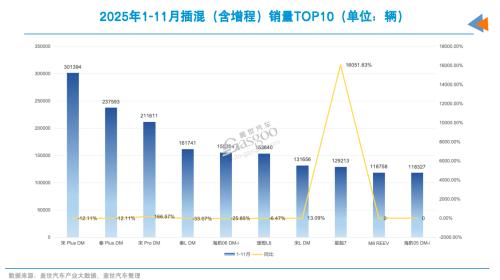 虽然12月销量数据尚未出来,但从1-11月的市场表现来看,2025年插混(含增程)车型销量前十名的格局已基本清晰。