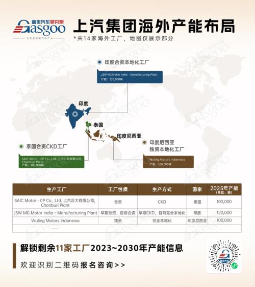 除比亚迪外,上汽集团14家海外工厂的发展进化轨迹也清晰可溯,已在印度、泰国、印度尼西亚等关键市场建立生产基地。其中,印度工厂从早期CKD组装模式升级为完全本地化生产,年产能达12万辆;印尼独资完全本地化工厂年产能同样达10万辆,以及工厂合资与独资模式的切换,均被数据库完整收录。