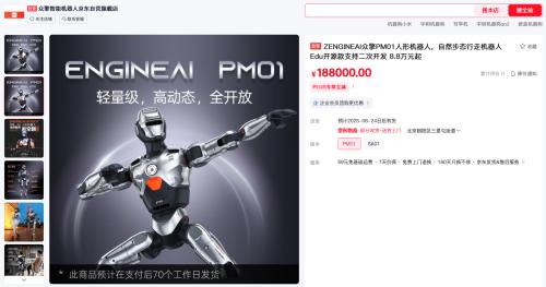 比如今年4月,众擎机器人宣布,其旗下两款人形机器人产品正式量产上市。其中,凭借与网红“甲亢哥”合跳“斧头舞”爆红的众擎ENGINEAI PM01轻量级人形机器人,以18.8万元的价格登陆京东自营旗舰店。