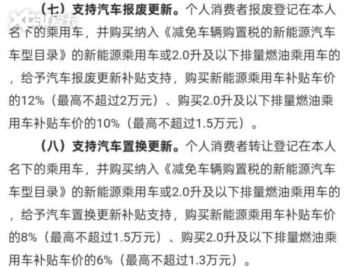报废更新方面,个人消费者报废本人名下乘用车后,购买纳入目录的新能源乘用车可享车价12%补贴(2万元封顶),购买2.0升及以下排量燃油乘用车享10%补贴(1.5万元封顶)。