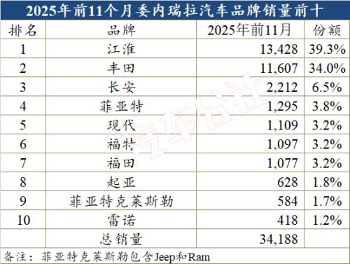 2025年前11个月江淮在委内瑞拉的市场份额为39.3%,再加上同样跻身十强榜单的长安、福田也创下近年来的历史新高,仅这三个自主品牌的份额之和就达到48.9%,已远远超过2024年的42%。