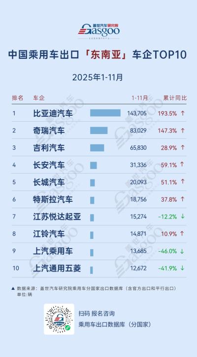 NO.1比亚迪汽车。1-11月,向东南亚出口143,705辆,累计同比增加193.5%。