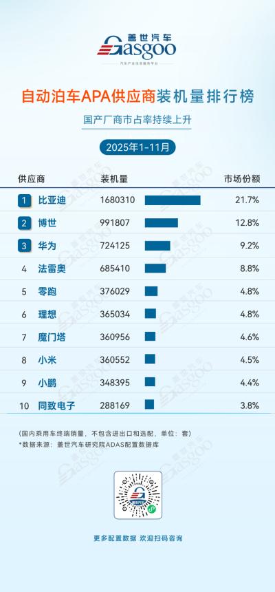 2025年1-11月国内自动泊车(APA)供应商装机量的格局,呈现出“国产阵营全面领跑、自研与第三方方案双轮驱动”的鲜明特点:比亚迪以1,680,310套装机量稳坐第一,其份额维持21.7%的高位,这背后是其APA方案与旗下车型的深度绑定,实现了交付端的规模化放量;而华为、魔门塔等第三方供应商,与零跑、理想等整车厂自研方案同台竞技,共同挤压了博世、法雷奥等外资厂商的空间——外资供应商仅占不足25%的份额,国产势力已成为APA市场的绝对主力。值得注意的是,国产APA方案的“多元化”是此次格局的核心看点:既有比亚迪、小鹏这类整车厂的自研方案,也有华为、魔门塔这类第三方供应商的通用方案,不同路径均实现了高装机量,说明国产APA技术已摆脱单一依赖,在适配性、功能体验上都形成了差异化竞争力。