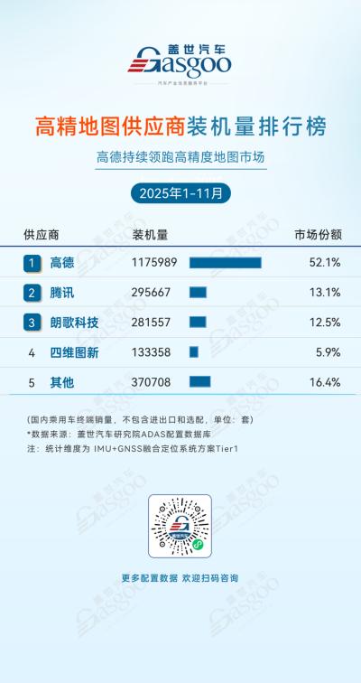 2025年1-11月国内高精地图供应商装机量榜单中,高德以1,175,989套装机量、52.1%的份额占据半壁江山,是市场无可争议的主导者;腾讯、朗歌科技等厂商紧随其后,但份额均未超过15%,与高德形成“一超多强”的格局。这一态势源于高德在高精地图领域的技术积累与数据覆盖优势——其方案适配多数主流车企的智驾系统,实现了规模化装机。不过,朗歌科技等新兴厂商的入围,也意味着市场并非完全固化,后续或在细分场景中形成差异化竞争。整体来看,高德的领跑地位短期难以被撼动,而行业的竞争焦点将逐渐向“地图更新效率”“辅助驾驶功能适配性”等细分维度转移。