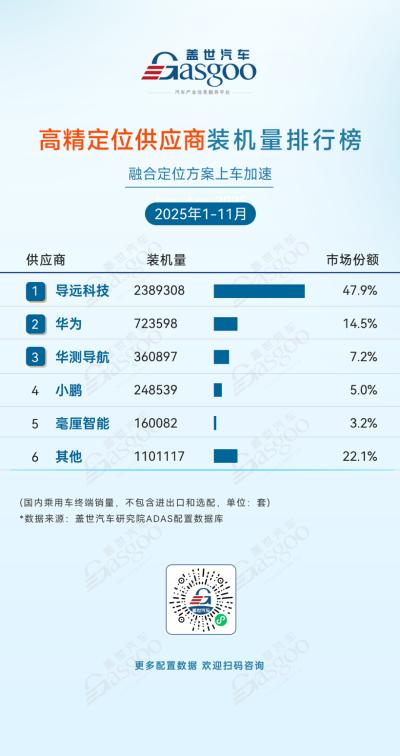 2025年1-11月国内高精定位供应商装机量格局,呈现“头部独大、国产厂商主导”的特点:导远科技以2,389,308套装机量、47.9%的份额占据近半市场,其融合定位方案的上车速度与适配性,是支撑高份额的核心优势。华为、华测导航等国产厂商紧随其后,其中华为以14.5%的份额位列第二,体现出头部科技企业在高精定位领域的技术落地能力。高精定位作为ADAS系统的核心硬件,其国产供应链已实现技术与市场的双重突破,后续竞争将聚焦于方案的精度、成本与场景适配性。