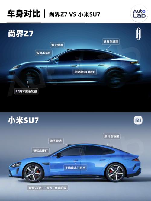 其他三款则显得更精干、更富有活力和冲劲,而小米SU7和尚界Z7,还能在车身上找到一些“保味儿”十足的设计。