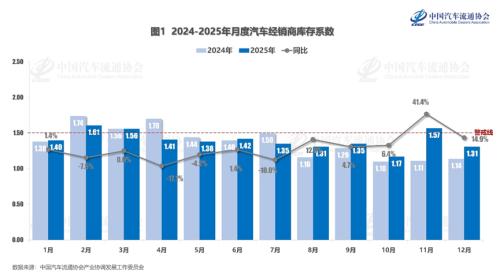 2026年1月13日,中国汽车流通协会发布数据显示,2025年12月汽车经销商综合库存系数为1.31,环比下降16.6%,同比上升14.9%,库存水平处于警戒线以下,但高于合理区间。以当月乘用车终端销量226.1万辆测算,12月末经销商库存总量约为300万辆。