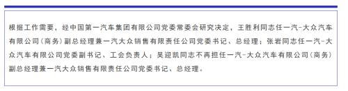 1月17日晚,据一汽-大众官微消息,根据工作需要,经中国第一汽车集团有限公司党委常委会研究决定:
