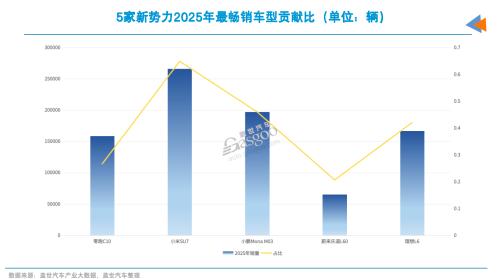 在新势力阵营中,爆品同样存在,且在相当长一段时间内扮演着更为关键的角色。从数据上看,新势力对单款爆品的依赖度显著高于传统车企。以小米汽车为例,其2025年全年销量突破40万辆,主要依赖两款在售车型贡献。其中,SU7作为其首款车型,全年贡献了约25万辆的销量,占比高达六成。