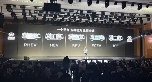 归元平台最显著的特征之一,是实现了“一个平台,五种动力”的全面兼容。它覆盖了PHEV(插电混动)、HEV(油电混动)、BEV(纯电动)、FCEV(氢燃料电池)以及ICE(高效燃油)全部动力形式。