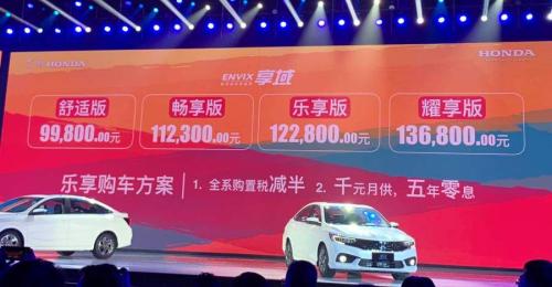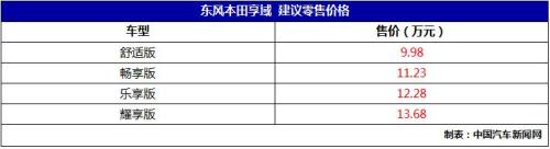 中国汽车新闻网讯4月10日,东风本田享域上市发布会在武汉、佛山、宁波、沈阳、重庆五城同步举行。享域搭载1.0T发动机,四款不同配置车型。售价9.98-13.68万元。具体车型售价如下: