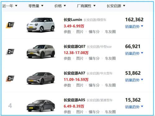 还是从长安启源来看,它本身具备打造爆款的能力,Q07就是最好的例子,但是Q07的势头没有做到持续性。而且对比吉利银河、奇瑞风云来看,长安启源推出新品的速度还是偏慢。当然,这种慢换个角度可以理解为,长安启源有心快速推出新车型,但渠道可能支撑不了庞大的产品阵营。