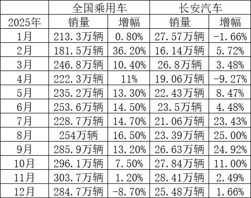 实际上,长安汽车在2025年交出了一份戏剧性的年度答卷:上半年销量增速落后于行业大盘,但自7月起却实现强势逆转,销量增幅连续数月跑赢市场。这张“V型”反转的成绩单,清晰地勾勒出长安汽车在转型深水区的阵痛与觉醒。