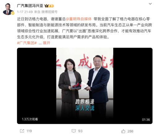起因是,1月15日,广汽集团董事长冯兴亚率队访问格力电器,与格力董事长董明珠及管理团队共商“人车家”智慧生态融合发展,探讨产业协同。冯兴亚在邀请董明珠体验昊铂A800时表示,广汽集团为其高端品牌昊铂专门做了一款攀登版,该车搭载1004颗芯片,且知识产权均属于中国。董明珠听闻笑称:“将来有500个是我的”,随后,冯兴亚表示:“下一步争取把你的车芯片都装到这车上来”。而这被部分内容也被媒体解读为明确合作承诺并广泛传播。此后,冯兴亚还在微博发布:“近日到访格力电器,谢谢董总@董明珠自媒体带我全面了解了格力电器在核心零部件、智能制造与新能源技术等领域的研发布局。当前汽车生态正从单一产业向跨领域综合性行业加速拓展,广汽要以‘出圈’思维深化跨界合作,才能有效推动汽车生态多元化升级,打造更能满足用户需求的产品和体验。”