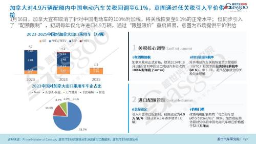 今年1月14日至17日,加拿大总理卡尼应邀对中国进行正式访问。访问期间,双方就深化经贸合作达成广泛共识,签署了《中国—加拿大经贸合作路线图》,其中和汽车产业相关的主要是:加拿大将允许不超过4.9万辆中国电动车,以6.1%的最惠国(MFN)关税进入加拿大市场,不再征收100%附加税,配额数量将按一定比例逐年增长,并明确这一规模不超过其汽车总销量的3%。