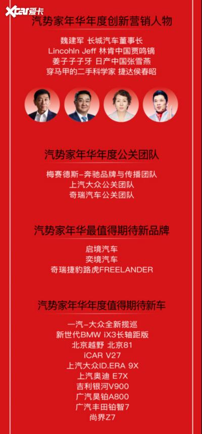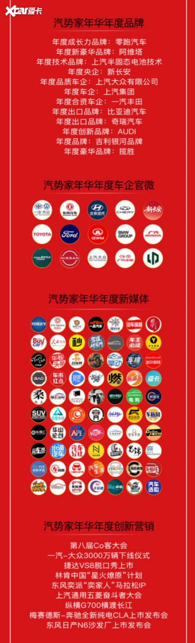 正是基于对产业深刻变革的洞察,本届汽势家年华的奖项评选体系科学而多元,完成了一次从“车”到“人”、从“前台”到“幕后”的完整呈现。评选历经市场表现调研、专业评测、专家与消费者投票等多重环节,旨在从年度车、年度车企、年度品牌、年度营销、年度车企官微、年度创新营销达人、年度公关团队,以及车企社会责任ESG年度金钥匙、年度新媒体和2026年最值得期待新车、新品牌等多个维度,褒奖中国汽车行业的2025的沉甸甸,以及2026年的未来可期。