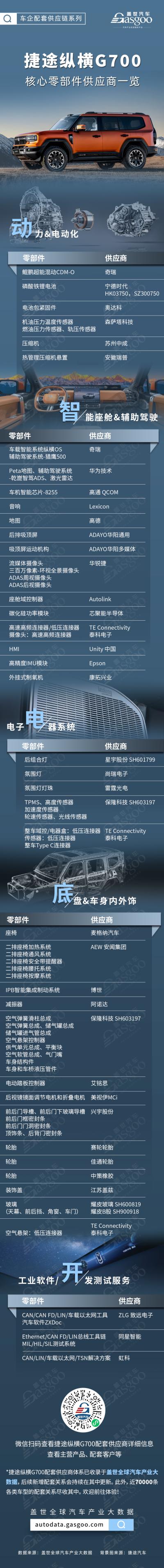 为进一步拆解这款旗舰SUV的核心竞争力,盖世汽车收集整理了捷途纵横G700的核心零部件供应商信息,欢迎更多行业朋友进行信息补充和更正。