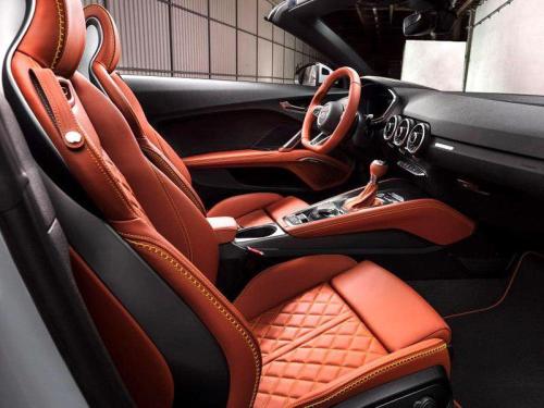 内饰方面,奥迪TT Roadster二十周年纪念版在座椅、方向盘、挡把以及门板部分处均由Moccasin棕色的Nappa真皮包覆,并采用了黄色的缝线,这样的设计同样是致敬了当年的奥迪TTS Roadster。新车同样在方向盘下端和中控旋钮处加入了特别版车型的专属标识。