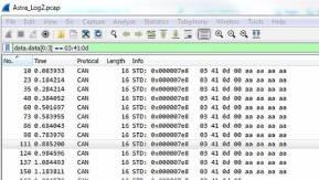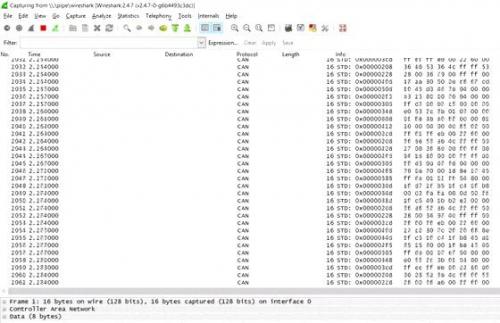将CLX000连接到汽车,可以通过USB实时传输原始CAN数据,然后通过CANvas打开Wireshark,以查看原始输入所显示的CAN帧,其中包括时间戳(timestamp)、CAN ID和数据字节。