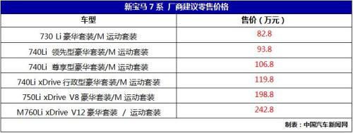 中国汽车新闻网讯5月24日,新宝马7系正式上市,新车共推出六款车型,售价82.8-242.8万元。新宝马7系采用了全新的外观设计,比以前更有气势;同时,内饰更为豪华,完美呈现了BMW的全新设计语言。另外,新宝马7还将提供个性化定制服务,并提供了丰富的定制化方案;客户还可以完全根据自己的偏好,对车辆进行完全定制。