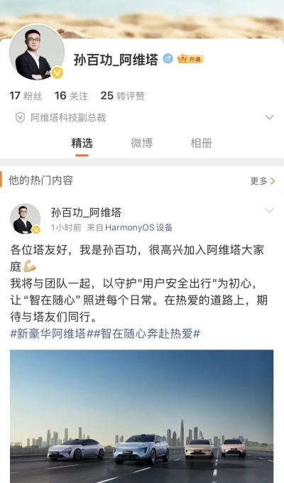 同时,孙百功发布微博称,“各位塔友好,我是孙百功,很高兴加入阿维塔大家庭我将与团队一起,以守护'用户安全出行'为初心,让'智在随心'照进每个日常。在热爱的道路上,期待与塔友们同行。”