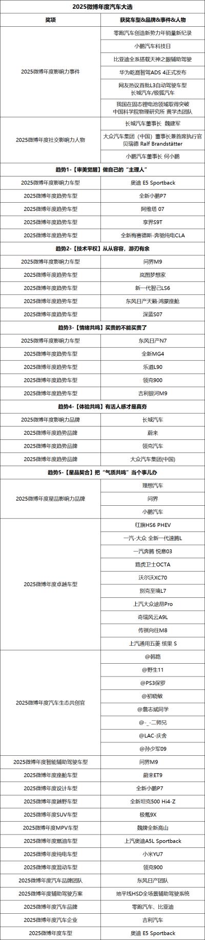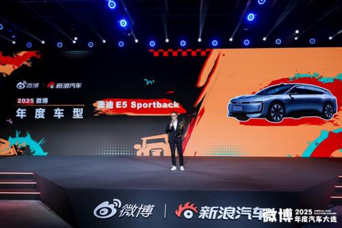 过去一年中,诸多现象级汽车热点在微博登榜,微博深入观察当下新世代年轻人购车趋势,通过微博社交属性不断助力汽车品牌的价值增长,帮助品牌重新定义产品功能点的情绪主张。就如新浪汽车微博运营主理人施晨浩在演讲中表达的观点,每一款车都会在微博上,被无数年轻人共同重新定义。也只有在微博,我们能够通过对用户进行场景化的洞察,找到年轻人的购车趋势。而基于此,立足当下用户需求的变化趋势,根据微博网友在智驾、座舱、设计、性能等方面的内容提及度,结合微博大V推荐、网友投票权重、核心评委打分权重,综合评议,微博年度汽车大选评选出2025微博年度智能辅助驾驶车型、2025微博年度座舱车型、2025微博年度设计车型等等。此外,综合车型在微博平台的热点、用户功能点讨论、专业质价比、社交传播与互动等多维度的声量表现,综合销量的突破性表现,经行业专家评委的综合推荐最终评定,奥迪E5 Sportback,荣获2025微博年度车型。