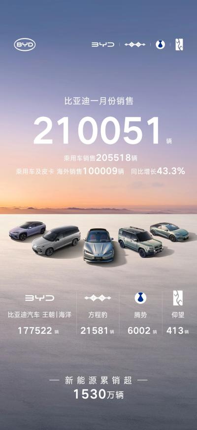 值得注意的是,比亚迪1月乘用车及皮卡海外销量达100,009辆,同比增长43.3%。这一成绩标志着比亚迪全球化战略取得关键突破,海外市场已成为其重要增长极。