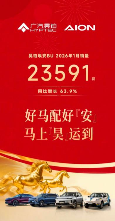 2026年1月作为昊铂埃安BU组建后的首个完整运营月,其销量表现尤为引人关注。数据显示,该月销量达到23591辆,同比增幅高达63.9%。这一逆势增长的态势,既延续了2025年第四季度以来的上升势头,也初步验证了埃安与昊铂双品牌一体化运营的可行性,在提升市场响应速度、强化渠道效能以及释放协同价值等方面发挥了积极作用。