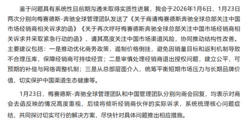 1月23日,商会第三次发函,再次致信奔驰全球总部,并在函件标题中明确呼吁采取“紧急行动”措辞。此次,诉求已从此前的具体政策调整,升级至要求总部介入,建立公平的经销商退出补偿机制、从全局平衡短期销量与长期品牌价值等结构性改革层面。