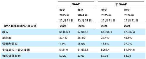 财务数据方面,2025年第四季度,安森美实现收入15.30亿美元,GAAP(公认会计原则,Generally Accepted Accounting Principles,简称GAAP)和非GAAP毛利率分别为36%和38.2%,GAAP和非GAAP营业利润率则为13.1%和19.8%,GAAP与非GAAP每股摊薄收益分别达0.45美元、0.64美元。