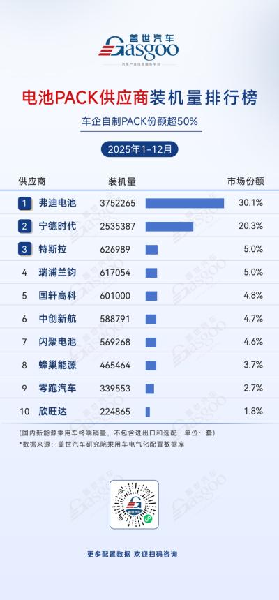 弗迪电池,2025年1-12月装机量3,752,265套,市场份额30.1%。