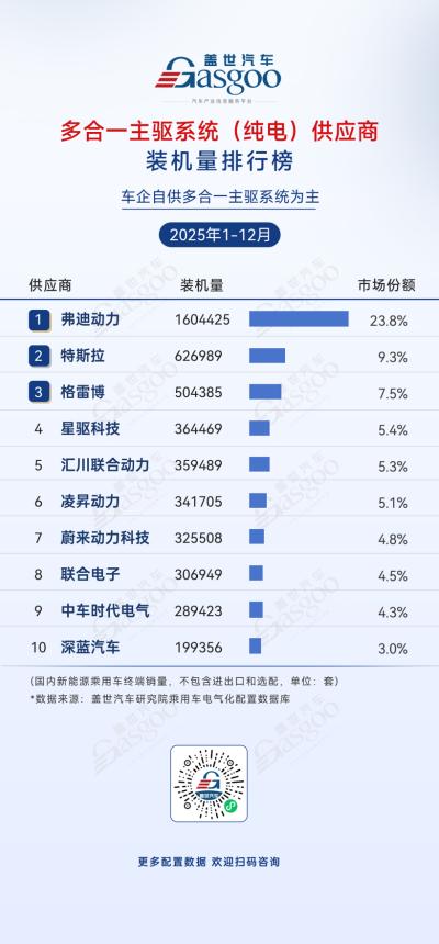 2025年,国内多合一主驱系统(纯电)市场已形成以车企自供体系为主、头部厂商集中度较高的竞争格局,多合一主驱系统正逐步成为主流电驱解决方案。弗迪动力以23.8%的市场份额位居首位,全年装机量达1,604,425套。依托比亚迪在电驱系统领域的垂直整合能力,其多合一主驱方案在系统集成度、成本效率及规模化应用方面具备明显优势。特斯拉以9.3%的份额位列第二,凭借自研电驱系统的持续迭代,在性能与工程成熟度上保持较强竞争力。与此同时,格雷博、星驱科技、汇川联合动力等专业供应商进入第一梯队,在定制化开发能力等方面形成差异化优势,持续获得多家整车企业配套机会。