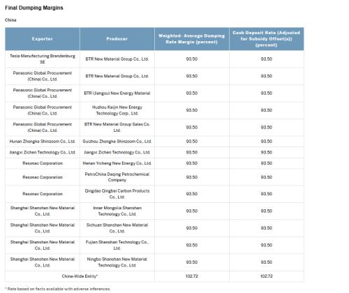 根据最终结果,美国将对用于锂离子电池的负极活性材料(AAM)——包括天然石墨、合成石墨、涂覆或未涂覆产品以及相关混合材料——同时征收反倾销税和反补贴税。这些材料是电动汽车电池及储能技术的关键原料。