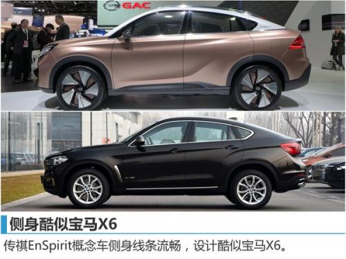 外观方面,传祺EnSpirit概念车融合轿车、SUV和敞篷车等元素。设计上延续传祺家族“凌云翼”式设计理念,车身侧面线条流畅,车尾以及车顶采用了溜背式和悬浮式车顶等设计元素,酷似宝马X6。