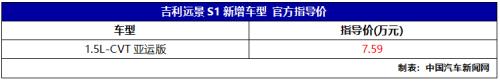 中国汽车新闻网讯近日,吉利官方发布吉利远景S1 1.5L-CVT亚运版车型正式上市,售价为7.59万元。新车为吉利远景S1新增车型,外观上延续了现款车型的设计风格,动力方面则搭载的是1.5L自然吸气发动机和CVT的组合。