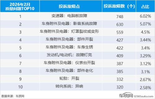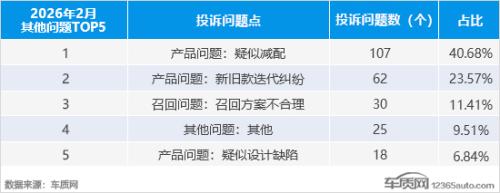 据国内领先的缺陷汽车产品信息收集和汽车消费者投诉信息受理平台车质网统计,2026年2月共受理车主有效投诉信息11,369宗(其中含第三方平台和后装轮胎投诉共40宗),环比下降约40.5%,同比下降71.6%。