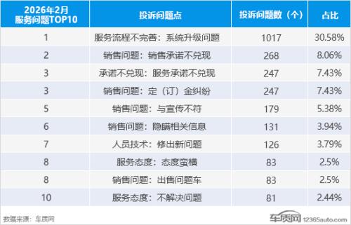 2月的服务问题中,销售问题和服务流程不完善的投诉问题数遥遥领先于其他服务问题,成为两大核心投诉点。其中,后者本月投诉问题数降幅最小,“系统升级问题”依旧排名TOP10榜单首位。