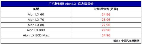 中国汽车新闻网讯10月17日,广汽新能源Aion LX正式上市,该车定位纯电动中型SUV,新车共推出5个版本,NEDC综合工况最高续航里程可达650km,售价区间为24.96万元-34.96万元。