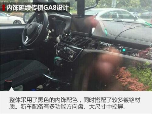传祺GM8的内饰设计延续了GA8的风格,整体采用黑色的配色,同时搭配较多镀铬材料装饰。新车配备有多功能方向盘、大尺寸中控屏。中控台整体造型及按键布局、空调出风口、仪表盘、三幅式多功能方向盘都与GA8相似。