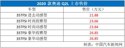 中国汽车新闻网讯近日,一汽-大众奥迪官方宣布旗下2020款奥迪Q2L正式上市,共计5款车型,指导价格区间为21.88-26.85万元。该车相比现款,入门版车型售价提升1100元,并且车型名称也有所调整。